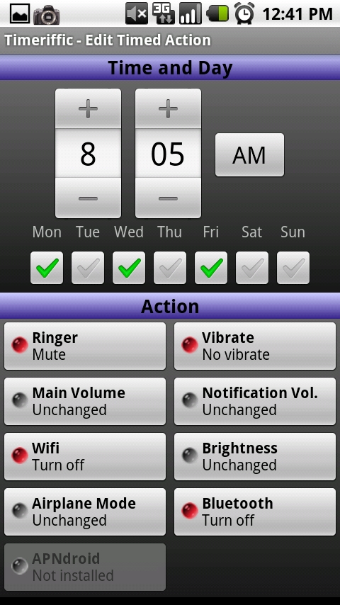 While this app doesn’t utilize GPS to change settings like wi-fi or bluetooth on your phone, it does use time of day. For someone like me, who pretty much leaves the house and arrives back home at almost the same time each day, this works out perfectly. In fact, this morning, I hopped in my car right around 7:40 and watched my phone to see if it would work and sure enough, it switched my bluetooth on, wi-fi off and I was ready to roll.