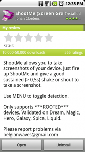 Wanted to introduce all of the rooted users out there to another screen shot application which is available for free on the market called ShootMe. This is a great alternative to Dropcap2 which seems to be the screen cap app most rooted users prefer. I actually have found ShootMe to be much faster while taking equally as nice of pictures.