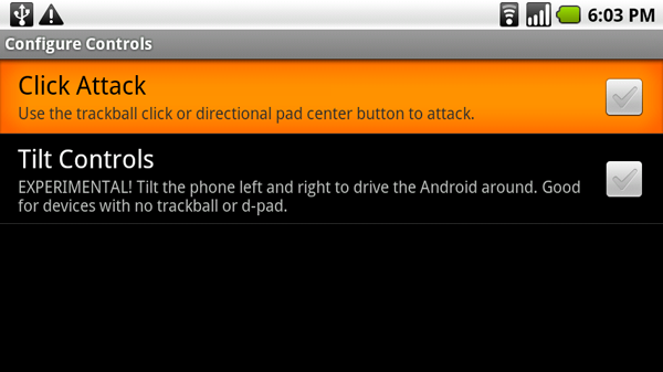On the Droid/Milestone, we have the luxury of a D-pad, which makes things much better. The space bar and “A” key both control the Android’s jump, while the D-pad’s button can be configured in the options menu to control the attack. It took a little while to figure that last configuration out, but it was well worth it.