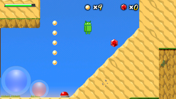 The game is a simple side-scroller featuring everyone’s favourite mascot, the Android. He rolls along levels collecting red gems and energy pellets, gaining an invincibility boost from every 20 of the latter. He can fly with the aid of limited jet pack, and can defeat enemies by smashing down on them from above. The developers also implemented a mind-control ability, enabling the Android to get his robotic enemies to do his dirty work for him, usually ending with their explosive demise.