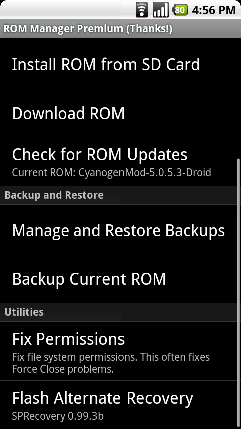 The people have been heard! That’s right, all of you struggling to return back to stock after flashing to the latest CyanogenMod can now relax. Koush’s ROM Manager received yet another update today, this time including an option to flash SPRecovery. Yay! Just open ROM Manager and scroll to the bottom to flash it…