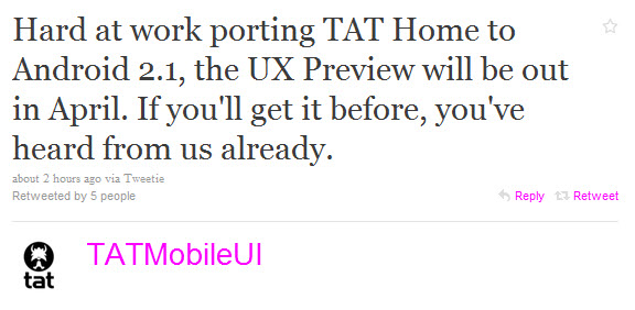 Everyone remember the beautifulness that is TAT Home? Everyone also remember the bad news we heard about it never coming to the Android Market? Well at least we got further confirmation this week that a preview of it will still be released to users some time in April. One of the issues holding the release back was probably due to the fact that the Droid was not on 2.1 yet. Well, TAT peeps, we’re on it now!