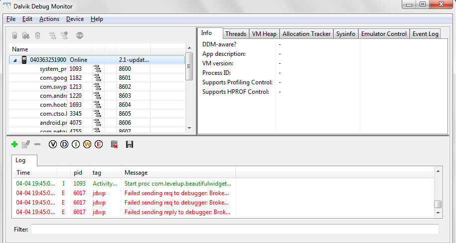 11. Open “ddms.bat” and wait for your phone to connect. You’ll know it’s connected when the “Log” starts becoming populated with info.