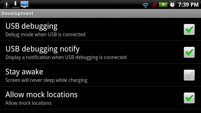 4. While those steps are finishing up, go into your Droid app settings and check the box for “USB Debugging.” (Settings>Applications>Development>USB Debugging)
