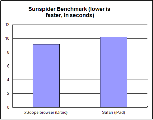 And Apple goes down again? The work-a-holic developer behind xScope, one of the top Android browsers, just sent me test results showing the iPad’s Safari getting crushed by a Motorola Droid during a recent SunSpider benchmark test. Yes you read that correctly.