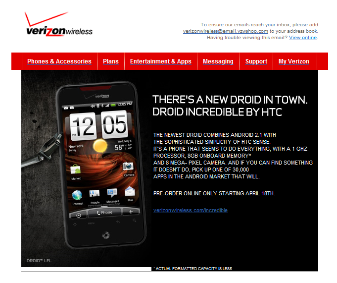 But for whatever reason, our 3 accounts waiting for Incredible updates have not received this email and we’ve also seen no one else across the globe with. The official Incredible site also hasn’t changed. So is it available for pre-order today at VZW or what? Maybe a type-o? It definitely is if you walk into a Best Buy or BB Mobile. Anyone receive this email from VZDub?