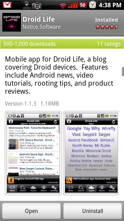 It’s here! The Droid Life app is finally available for you all to download in the Android Market. While this app doesn’t have any groundbreaking features, it is a nice reader-style app and will allow many of you to follow both our Twitter and blog feeds in one simple place. And yes, this puppy is free.