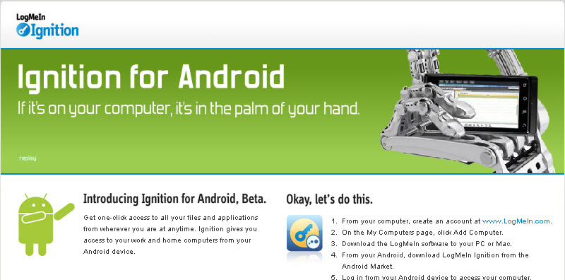 Want remote access to your PCs for free through your Motorola Droid? Check out LogMeIn’s Ignition which just went into beta on Android. It’s a pretty simple PC install followed by the app download to your phone leaving you cruising around your computers remotely within minutes. This is seriously a pretty cool app.
