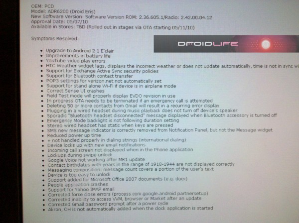 The update for the Droid Eris was rumored to be coming “soon” and it looks like “soon” meant May 11th. Initially, we weren’t sure if it would be coming with 2.1 as the Verizon site failed to mention anything about the OS on their official page. Luckily they include that info when informing their employees.