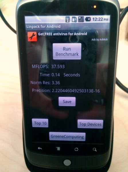 Ian Douglas, a web architect over at Armor Games has managed to get a hold of a Nexus One running Android 2.2 and posted a screenie of a Linpack Benchmark test which shows the device clocking in at 37.593 MFLOPS. What does that mean exactly? That Froyo now includes something, (possibly JIT) which is making the device unbelievably fast.