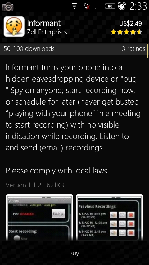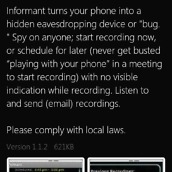 - Informant: ($2.49) Want to secretly record a conversation? Here is your app. You can even set the thing to record on a timer meaning you can eavesdrop on someone without being present.