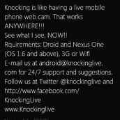 - Knocking Live: (free) Allows your phone to act as a mobile webcam on both 3G and wifi.