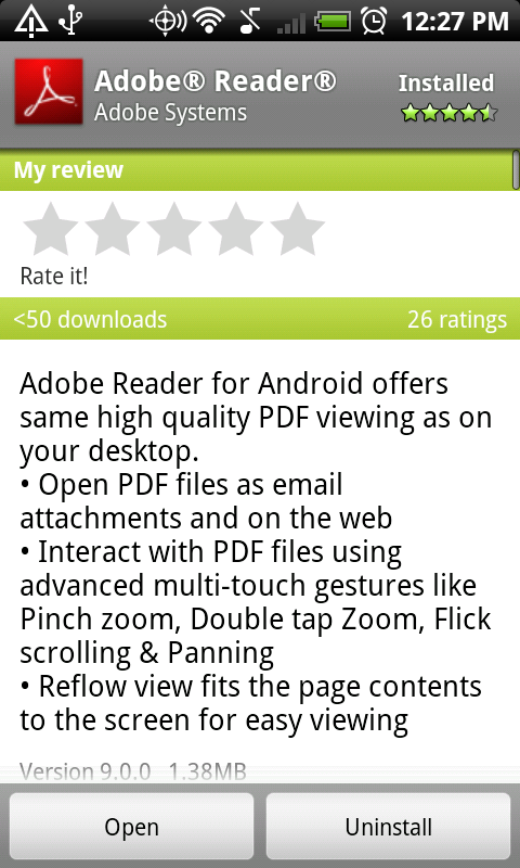 After the announcements of Flash 10.1 and Android 2.2 last week, the release of the official Adobe Reader app on Android sort of got brushed aside. In fact, this was announced on May 20th and we may be the first to report on it. Crazy. And after looking at the market and seeing less than 50 downloads, I’m thinking the general public hasn’t really heard about this either.