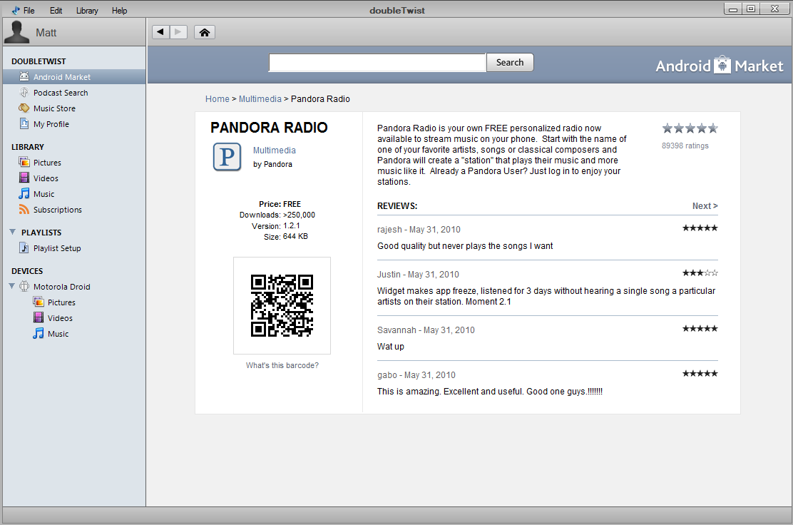 That’s right. A client with access to the Android Marketplace does not allow you to download apps: DoubleTwist themselves tell you to download a bar code scanner app for that. It doesn’t allow you to bookmark, list, sync, update or share them, either. It doesn’t even let you comment/rate applications within it’s window: the site’s FAQ tells you to go to back to your phone for that, too. In essence, it doesn’t do anything of the things that I would expect a client to do, nor does it make it any easier to use my phone. The only advantage I can think to using this program is because the listings are ad-free and look pretty. That’s it.