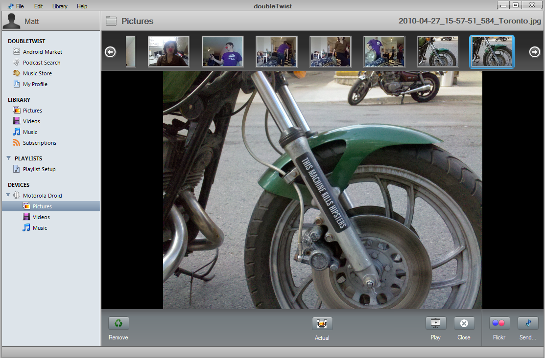 Another thing I would consider using a client for would be to view what’s on my phone already – not applications or anything (because DoubleTwist doesn’t do that, either), but pictures and video. DoubleTwist does do this, but there seems to be a big roadblock: I can’t get them off my phone.