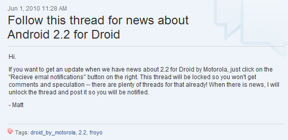 Just as they did when Android 2.1 was on its way, Motorola is allowing users to sign up to receive notification when Froyo launches on the Motorola Droid. While you should refrain from throwing a Froyo party today, this does at least help confirm that our beloved Droid will receive 2.2 in the future. When exactly? Sometime in June still? We can only hope.