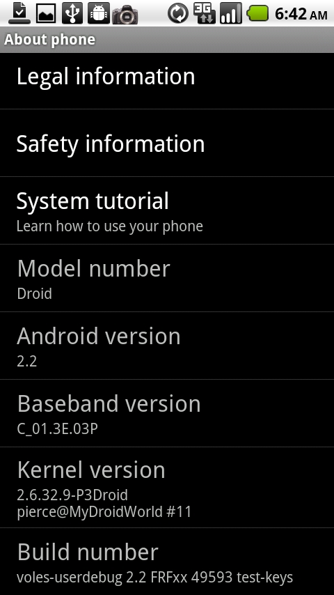 So what do we have here? An apparent early 2.2 build for the Motorola Droid. I say early because it appears to have a ton of missing features from the Nexus One Froyo and also has a few bugs. With that said, the MyDroidWorld guys have made it easily installable via nandroid backup in both ClockworkMod and SPRecovery, so anyone with root access can check it out. When you are finished, you will keep root access and your custom recovery, so just make sure to backup your current settings in case something bad happens.