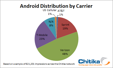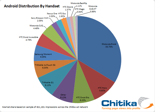 Online ad company Chitika, released information today showing Android distribution numbers by handset and carrier. As you may have expected, your Motorola Droid is completely stealing the show. Making up for just over a 3rd of all Android handsets on the market, you can easily attribute the success to the monstrosity of a marketing campaign which continues to this date, and a nicely timed holiday release in 2009. Seriously though, one third. Wow.