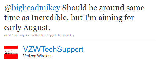 An unofficial Verizon Tech Support Twitter account basically confirmed today that the delay of the OTA update for the Droid Incredible is because Android 2.2 will now be included. Yes, “unofficial,” meaning they admitted to being official tech reps, just not ones endorsed by corporate VZW. Even so, we’re guessing they still have a pretty good inside track as to update statuses.