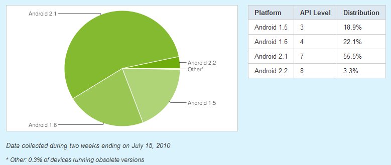 Now obviously this chart is going to change dramatically when Froyo hits all of the Droid lineup in August and then during the holidays when HTC polishes off the new version of Sense for 2.2, but that’s a good thing. We’ll continue to have fragmentation forever, but at least it’ll be up-to-date fragmentation spread across just a few versions of Android.