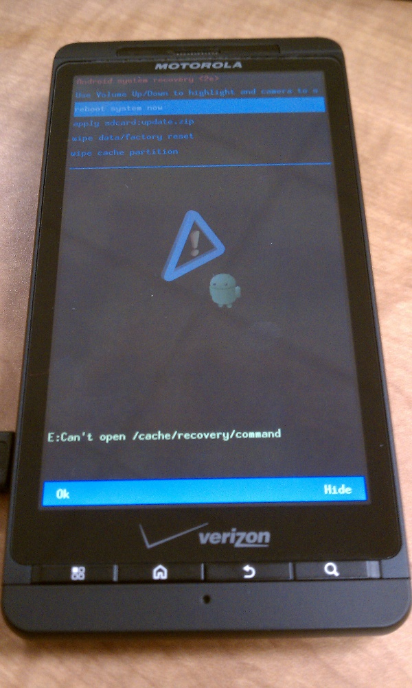 To get out of it, simply use your volume up and down buttons until “reboot system now” is highlighted and then press the camera button.