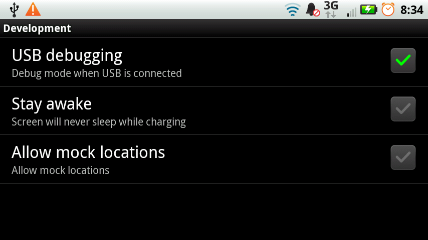4. While those steps are finishing up, go into your Droid app settings and check the box for “USB Debugging.” (Settings>Applications>Development>USB Debugging)
