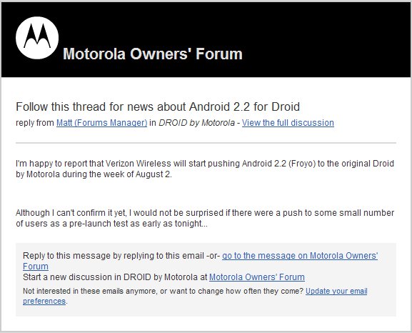 If you were signed up through Motorola’s forums to receive notification of the Android 2.2 rollout for the Droid, then you probably just received the email above. What’s amazing about this? It mentions that a few test updates will start rolling out to users as early as tonight.