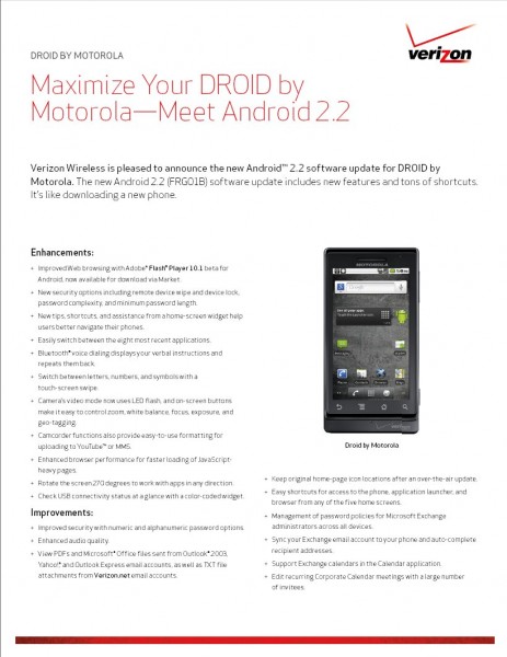 There is your official details list for FRG01B Froyo OTA update which will land on the Motorola Droid next week. Welcome to Froyo non-roots! (Kidding, kidding.)
