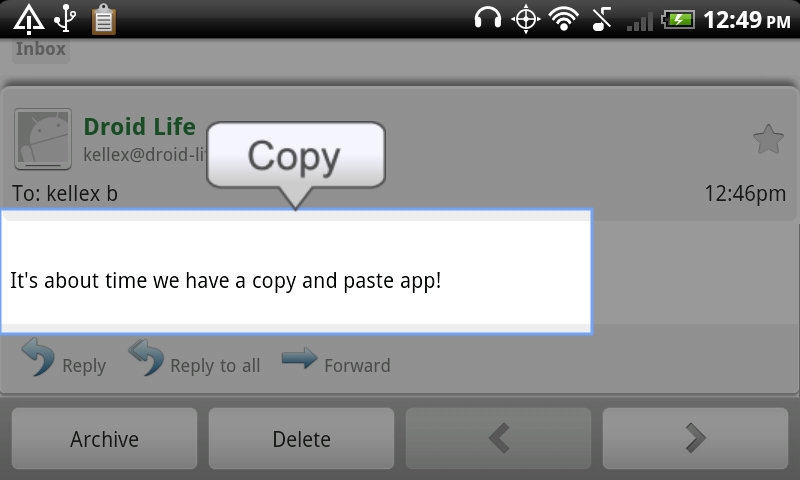 We just received an email from an app developer who has created an app that will change Android lives forever. A copy and paste app! And yes, it even works in Gmail! I know, I know, HTC’s Sense lets you copy and paste some stuff, but it doesn’t even go as far as Gmail awesomeness. The app is called Copy Paste It.