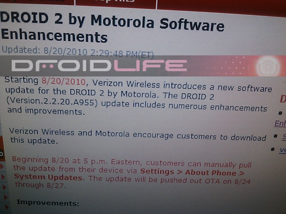 On a related note, it looks like Verizon may be allowing user initiated updates for their new Droid family member. If you check out their update installation instructions, there are now 2 types of software loading: user initiated and server initiated. We also just received this shot which shows that manual updates could start as early as last night, and OTA server initiated updates will start on the 24th if users have not already gone through the process…