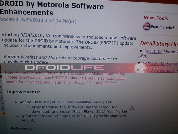 The tip showing that FRG22D Froyo was headed to the Droid came across like 30 minutes ago and we can already confirm to you that the update will hit your D1’s starting tomorrow, August 24th. The update on top of your FRG01B Android 2.2 will allow you to download official Flash 10.1 from the market, finally. Of course you can download from here right now if you can’t wait.