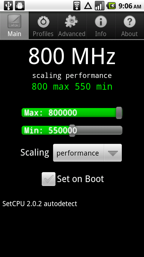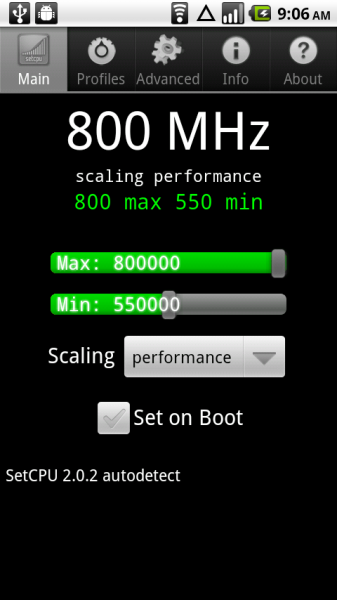 All you need to do now is root that Droid 1 of yours using Universal Androot, download SetCPU from the Market and overclock to a number of speeds. No more custom kernels people. While you won’t see those 1.0GHz monster numbers since the stock kernel can’t crank that high, you will still find 600, 700 and 800MHz speeds which should do you just fine.