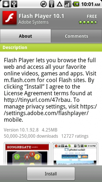 If the leaked beta versions of Flash 10.1 for your Droid aren’t cutting it these days, especially with the official version launching on the market for the Nexus One last week, then we have a solution for you. Root your Droid and install the latest CyanogenMod 6.0.0 RC3 build through ROM Manager and it should appear for you in the market as you can see from the screenies above.