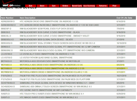A new “end of life” device list appeared late yesterday afternoon and features specific dates for every major Verizon smartphone including the new Droid 2 and Droid X. Don’t worry just yet though, the date given to both devices is 3/31/2011 which puts both out of commission about 8 months after their release. Wait really? Seems a little early right? The original Droid at least lasted 10 months before being taken off the market.