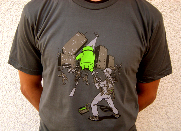 The should-be-award-worthy Android t-shirt series that we’ve been covering is back with a new edition, the Unstoppable Andy. Following up on the Andy vs. Apple release, this new gem takes the evil empire vs. the good guys one step further. Notice the attenna Ghostbuster pack? Notice its failure? Priceless.