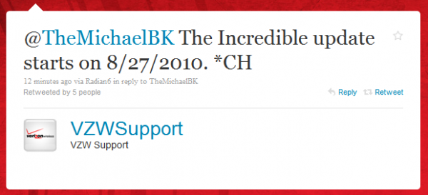 The official Verizon Support Twitter account has weighed in this morning with news confirming that the Incredible Froyo update indeed starts today. (And yes, this account has been verified.) While this isn’t news to us after we showed the world an email from Verizon with today’s date on it yesterday, I do hope this helps some of the doubters out there, because damn, there are a lot of you. (Smiley!)