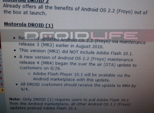 Don’t worry, we haven’t been ignoring any of your tweets regarding the status of the FRG22D Froyo update for the original Droid which allows Flash 10.1 to be downloaded from the market, we were simply waiting to hear from VZW. It appears as if the rollout for the update could last through 9/4 so you’ll need to remain somewhat patient if you have yet to see the notification hit your device.
