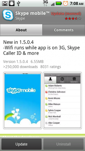 An update to Skype is available and at first glance seemed like it included one major update, calls over wi-fi! Well if you read the description of this update a little closer, you can see that you can still only makes calls over 3G, but it will no longer kick off your wi-fi as it did in previous versions. While this is a much needed update, many of you will be disappointed to not have an option for wifi-only. Sorry folks!