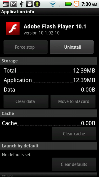 Adobe announced last night that a security flaw in the latest version of Flash 10.1 for Android has been found and a fix is in the works. If your version looks like mine in the screenshot above reading “V10.1.92.10” then you have the newest version which they are referencing. The flaw was discovered as hackers were actively using an exploit on Windows machines running Flash 10.1.82.76, but to cover all bases, Adobe plans on issuing a fix to all of their platforms. By the week of September 27, 2010 they are hoping to have the fix ready for consumption, but yeah, that is almost 2 weeks away. If you are feeling uneasy about that period of time, feel free to simply uninstall it.