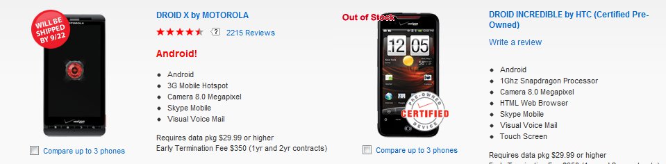 The Droid X seems to have been plagued with the same stock issues as the Droid Incredible, although as far as we know should have nothing to do with screen availability. We really have to assume that delayed shipments are from high demand and a need for users to have such a big a** screen taking up every last inch of their Diesel jeans pocket. As you can see from the shot above, the DX has now been pushed back to 9/22 as the next available shipping date, but reports from many of our readers lead us to believe that they are arriving much earlier. In fact, a meager 8 day delay isn’t too bad really.