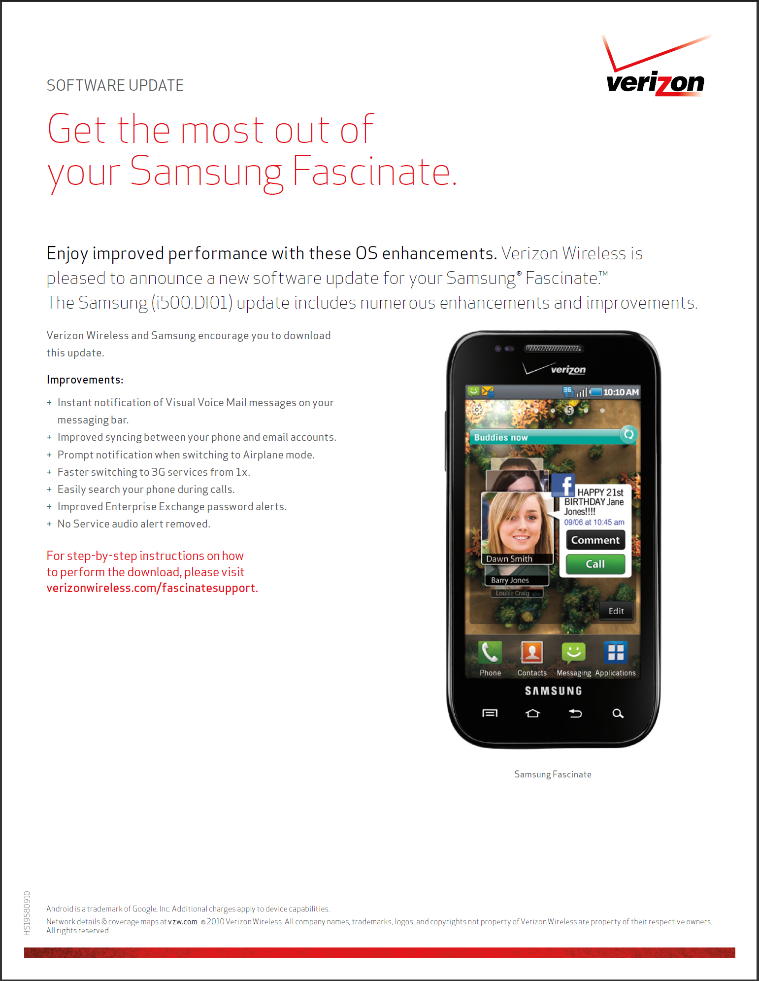 On the same day that we broke the news on the Droid X 2.2 update, an update appears to be on the horizon for the Samsung Fascinate as well only it’s not quite as big of a deal. Fascinate owners will not be receiving Android 2.2, but will instead see a few other bugs fixed. It looks like VZW is hacking away at that ugly list of known bugs that snuck out just after launch.