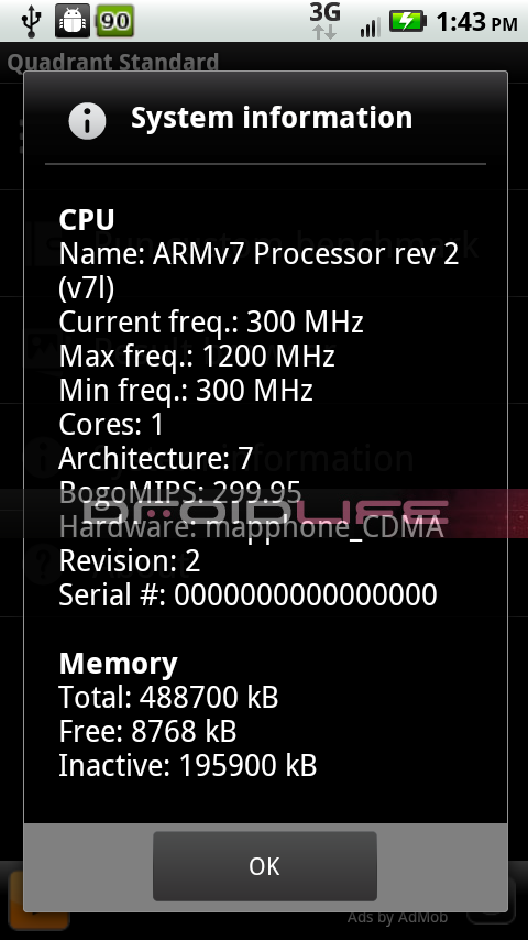 We first showed you our exclusive shots of the Droid 2 Global and now have even more goodies from this amazing looking device. Who wants some Quadrant system info and benchmarks? Unfortunately we don’t have screenshots, but this is the information we’ve been given we have no reason to question. How does an ARMV7 clocked to 1.2GHz sound? 1709 benchmark?