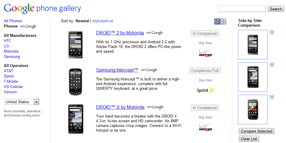 We say compare “select” Android phones in Google’s new phone gallery because they haven’t provided a comprehensive list of every single Android phone available. For whatever reason, Google has decided to feature certain phones from each carrier, leaving off some pretty major players like the Samsung Fascinate (our review). Is it the Bing?