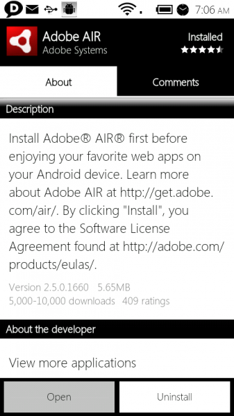 In the description from the market, Adobe is directing you to http://get.adobe.com/air which doesn’t get you much at this time. If you want some AIR apps right now, then after you do a search for “Adobe AIR” in the market, check out all of the apps that show up below it. And if you were wondering, AIR apps in general will be available in the market and install just like any other app would.