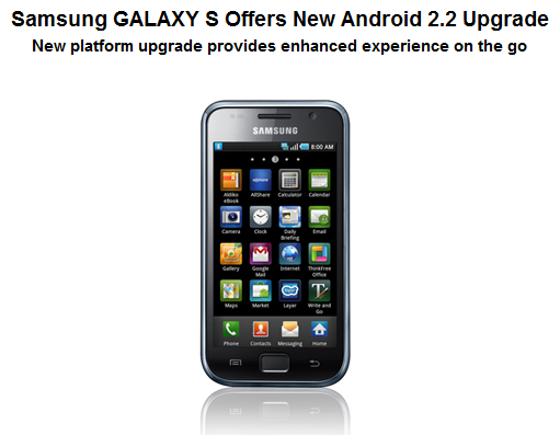 SEOUL, Korea – October 18, 2010 – Samsung Electronics Co. Ltd., a leading mobile phone provider, today announced the Android™ 2.2 (Froyo) upgrade to the Samsung GALAXY S, giving users access to new features, enhanced navigation applications and improved performance.