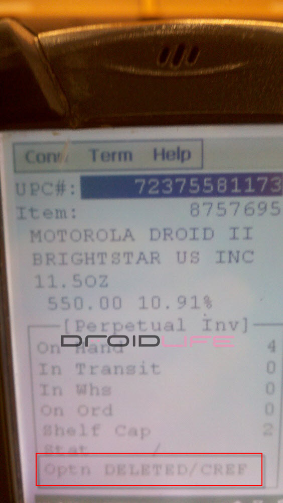 Over the weekend, Walmart received a recall for their remaining Droid 2 devices leaving us to believe that the Droid 2 Global should be arriving any day now. As you can see from the shot above, there is a missing device now in this specific store’s display which used to be occupied by the D2. We also have a picture below from one of their inventory guns which clearly shows that the D2 has been deleted from their system.