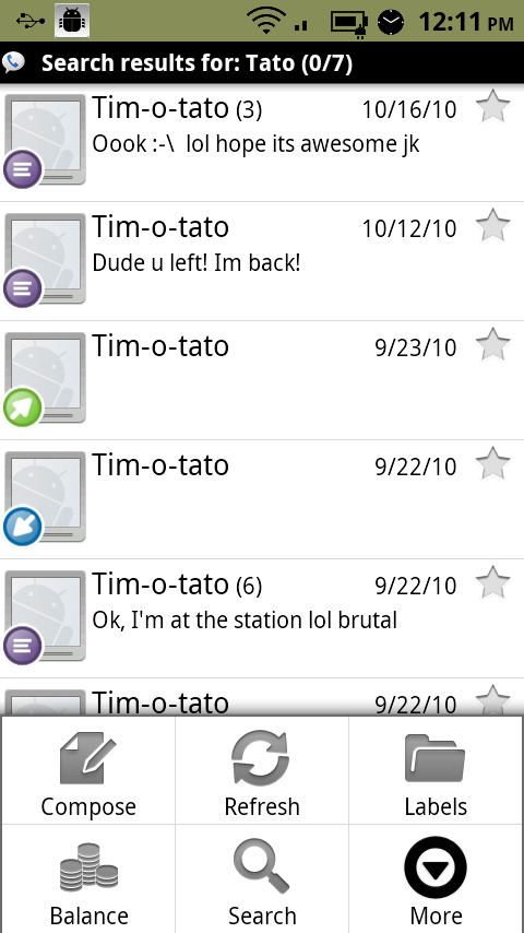 Google Voice just received a much needed update that allows you to search through your voicemail transcripts and text messages. As you can see from the shot above, you can now easily see how many times your writers spam your inbox…err. (Hi Tato!) As you would also expect from a search giant, this new feature works very well and a button for it has now replaced the “Settings” option you once received when hitting menu.