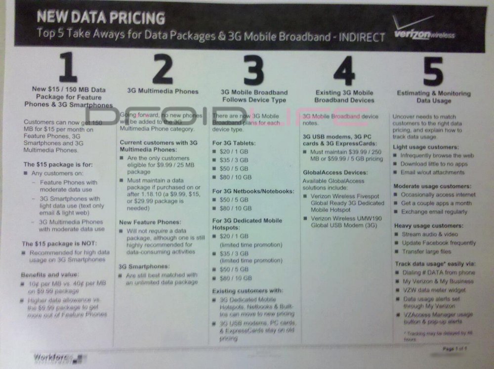 Wanting to know every single detail on the new tiered 3G data plans coming to Verizon? We’ve got you covered. As was rumored earlier in the week, the new $15/150MB tier is expected to go live by October 28th and while Verizon documents no longer feature dates for the most part, the 28th and 29th have been brought up more than once, so we’re expecting it any day.