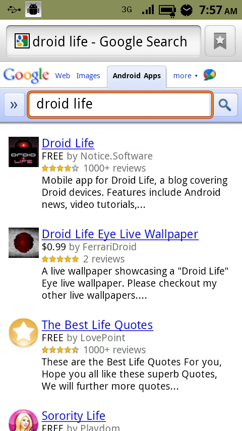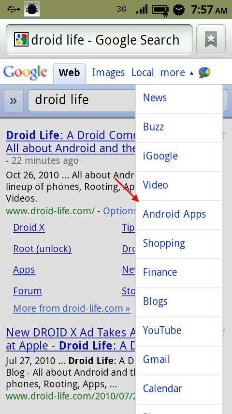 Not a big fan of the way the Android Market searches for apps? Then feel free to use regular old Google Search for the task. If you open up google.com from your mobile browser and hit the “more” pull down menu, you will see the option to search for “Android Apps.” Once you find the app you have always dreamed of, like ours, tap on it and you will be redirected straight into the market for installation. Sweet right?