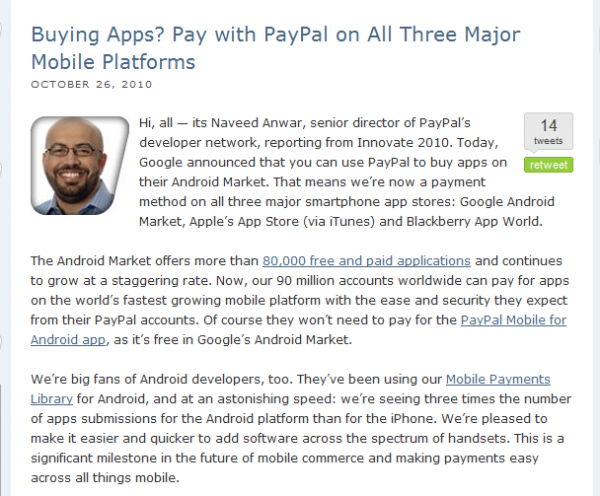Yesterday, it finally seemed that our prayers had been answered, as a statement was posted on PayPal’s corporate blog announcing that apps could now be purchased on the AndroidMarket with PayPal. It was wonderful, outstanding, … Keep reading after the break to see a screenshot of the post that was pulled a mere seconds later. Read More… Visit TalkAndroid for android news, android guides, and much more! PayPal announces Android Market payment support, then takes it back …